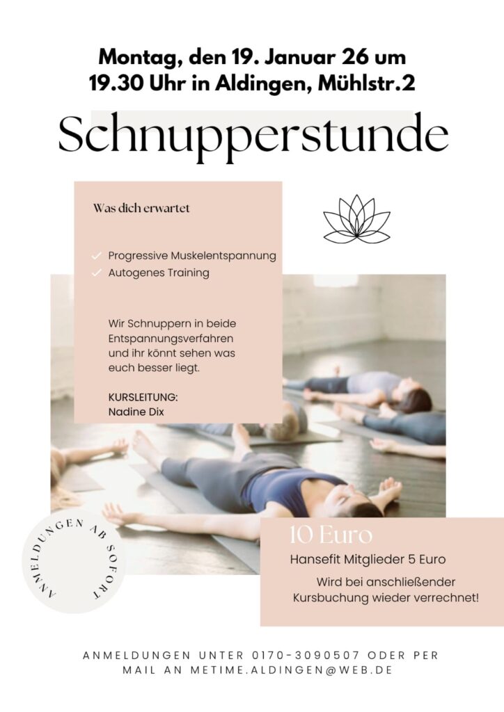 Gepostet auf Ines BTrustindex überprüft, ob die Originalquelle der Bewertung Google ist. Der beste Ort zum Entspannen, weit und breit 😍Gepostet auf Karin BoyTrustindex überprüft, ob die Originalquelle der Bewertung Google ist. tolle Angebote und geniale Ideen für Groß und Klein... liebevoll eingerichtete Räume... Ich wünsche dir weiterhin ganz viel Erfolg.Gepostet auf Elvira BeyerTrustindex überprüft, ob die Originalquelle der Bewertung Google ist. Wir, mein Mann und ich, haben mit einem Schnupperkurs bei MeTime angefangen und waren total begeistert. Nun sind wir in einem 10 wöchigen Kurs für Progressive Muskelentspannung und traurig, dass er fast zu Ende ist. Wir haben im Anschluss gleich einen Kurs für Autogenes Training gebucht und freuen uns, dass dieser bald los geht. Nadine ist eine total liebe und sehr einfühlsame Kursleiterin. Ich hätte nie gedacht, dass ich mein Hirnkarusel in den Griff bekomme. Nadine hat es geschafft. Es geht uns beiden deutlich besser und wir sind froh, dass wir MeTime für uns gefunden haben. Auch die ganze Atmosphäre in den liebevoll gestalteten Kursräumen ist einfach zum wohlfühlen und runterkommen. Nadine, vielen Dank für viele schöne, entspannende und wohltuende Stunden.Gepostet auf VaniTrustindex überprüft, ob die Originalquelle der Bewertung Google ist. Nach einer Schnupperstunde bei Nadine für das Autogene Training und die Progressive Muskelentspannung, begann ich den PME Basiskurs. Ich kann mir nun meine wöchentliche „Me Time“ bei Nadine gar nicht mehr von meinem Alltag wegdenken. Es herrscht eine tolle Atmosphäre und Nadine macht das ganz ganz toll. Ich bin ein sehr energievoller Mensch und konnte mich eigentlich gar nie entspannen, doch bei Me Time klappt das von Anfang an hervorragend und bereichert mein Leben enorm. Die Gruppen sind kleingehalten und man wird eine richt kleine Gemeinschaft und toll aufgenommen. Ich kann es jedem nur wärmstens empfehlen. Daher ⭐️⭐️⭐️⭐️⭐️ und noch viel mehr.Gepostet auf Bärbel MattesTrustindex überprüft, ob die Originalquelle der Bewertung Google ist. Ich hatte das große Glück, im März mit der PMR bei Nadine beginnen zu dürfen. Den Kurs kann ich nur empfehlen. Die Räumlichkeit ist sehr angenehm, Nadine tut alles, dass man sich rundum wohl fühlt. Im Kurs taucht man ein in die totale Entspannung, mir fällt das gewöhnlich überhaupt nicht leicht, aber bei Nadine klappt das nahezu immer. Was ich sehr schön finde, die Teilnehmerzahl ist begrenzt, es sind Kleingruppen, wir waren zu fünft 😊. Ich kann das MeTime allen zu 100% empfehlen, die einfach mal abschalten und genießen möchten. Was top ist, man kann sich über Hansefit anmelden und braucht somit den Kurs nicht extra bezahlen. Wer Hansefit nicht hat, sollte mal bei der Krankenkasse nachfragen, bei mir werden solche Kurse z. B. bezuschusst.Gepostet auf Betina KlugeTrustindex überprüft, ob die Originalquelle der Bewertung Google ist. Empfehlenswert. Schönes Ambiente. Sehr nette Kursleiterin. Entspannung pur.👍Google Gesamtbewertung 4.7 von 5, basierend auf 7 Bewertungen
