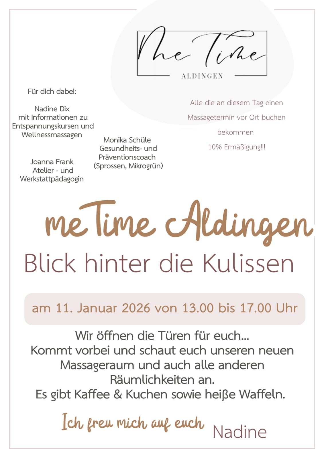 Am 11. Januar 2026 öffnen wir von 13:00 bis 17:00 Uhr unsere Türen für euch – und laden euch herzlich dazu ein, meTime Aldingen ganz persönlich kennenzulernen.